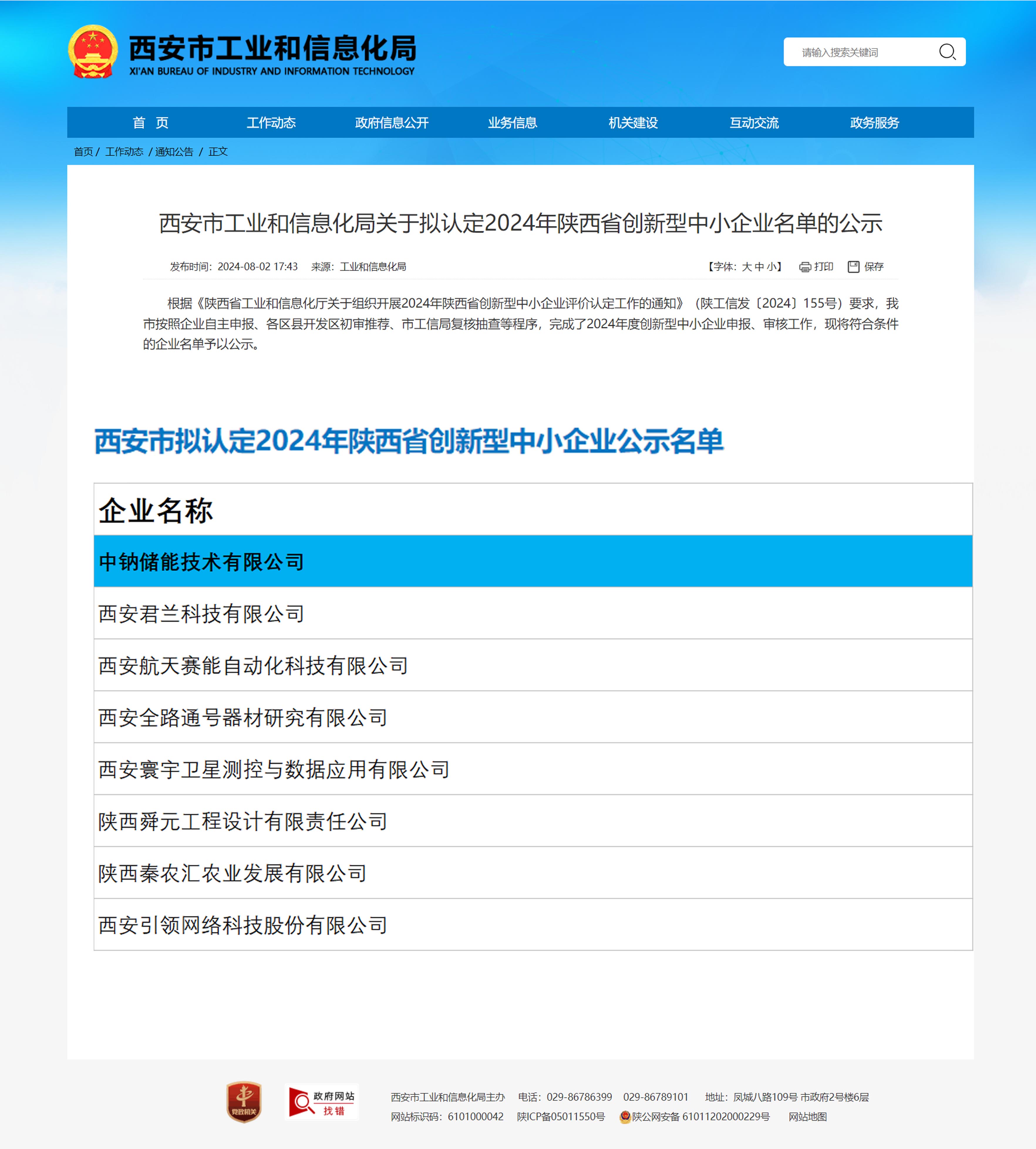 2024年8月2日,根據(jù)《陜西省工業(yè)和信息化廳關(guān)于組織開展2024年陜西省創(chuàng)新型中小企業(yè)評(píng)價(jià)認(rèn)定工作的通知》(陜工信發(fā)〔2024〕155號(hào))要求,西安市工業(yè)和信息化局完成了2024年度創(chuàng)新型中小企業(yè)申報(bào)、審核工作,并予以公示。經(jīng)過征集申報(bào)、初步審核、專家評(píng)審等評(píng)選程序,中鈉儲(chǔ)能技術(shù)有限公司(下稱“中鈉儲(chǔ)能”)以絕對(duì)的攻關(guān)技術(shù)和研發(fā)創(chuàng)新實(shí)力成功入選。